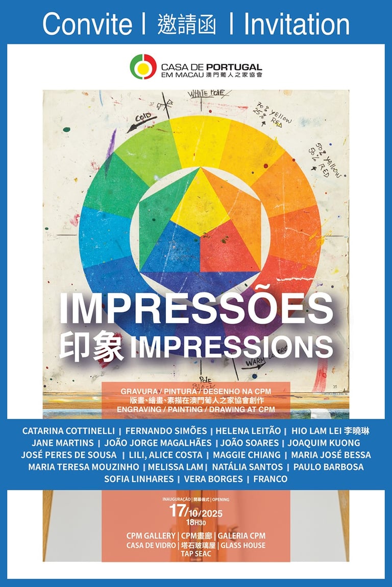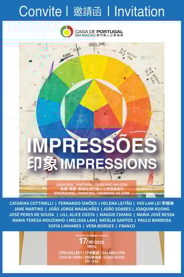 A Casa de Portugal em Macau tem o prazer de convidar para a inauguração da exposição “Impressões”, uma mostra que reúne trabalhos de Gravura, Pintura e Desenho produzidos nas oficinas da Escola de Artes e Ofícios da CPM, sob a orientação do artista Joaquim Franco.